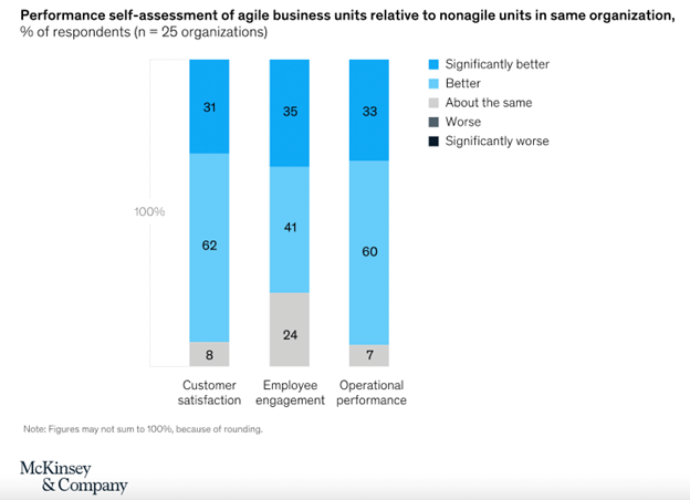 Agile software development methodology is seen by many as the most efficient way to develop tech products. It’s when projects are split into bitesize stages and managed by a team that adapts quickly and operates flexibly. As you can see in the graph below, agile working performs better than non-agile methods, even within the same company.