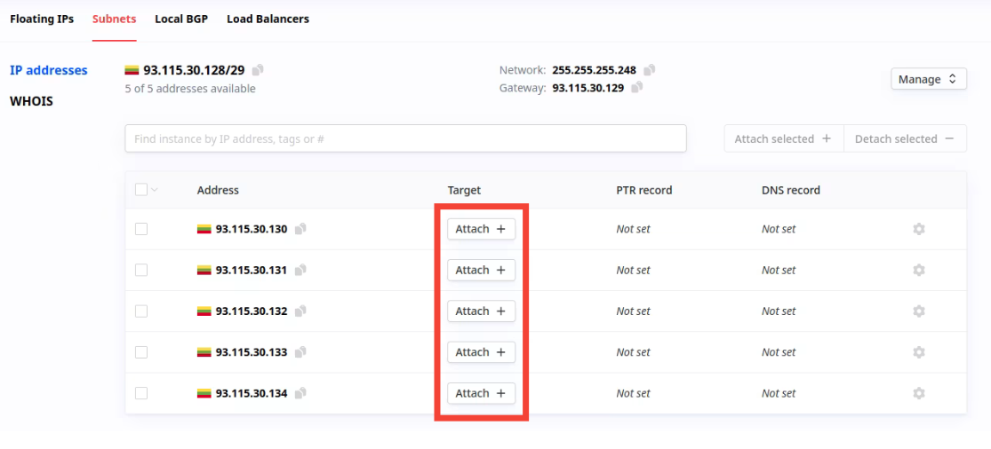 - Once you've identified the IP address you want to assign to your server, click the "Attach +" button next to that IP address. This action lets you associate the selected IP address with your server.