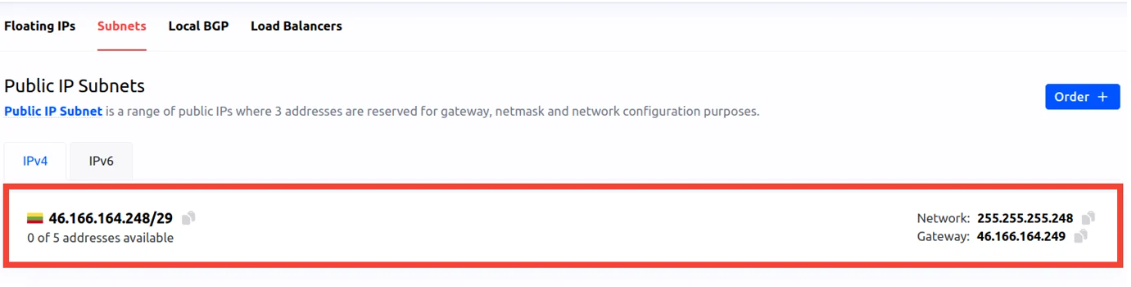 While all servers are deployed with a Management IP address by default, which provides a fixed address for each server, assigning a public IP subnet to a server allows for multiple IP addresses to be used on the same server, with specific IPs reserved for essential network functions. Please note that presently subnet services are only available for dedicated bare metal servers.
