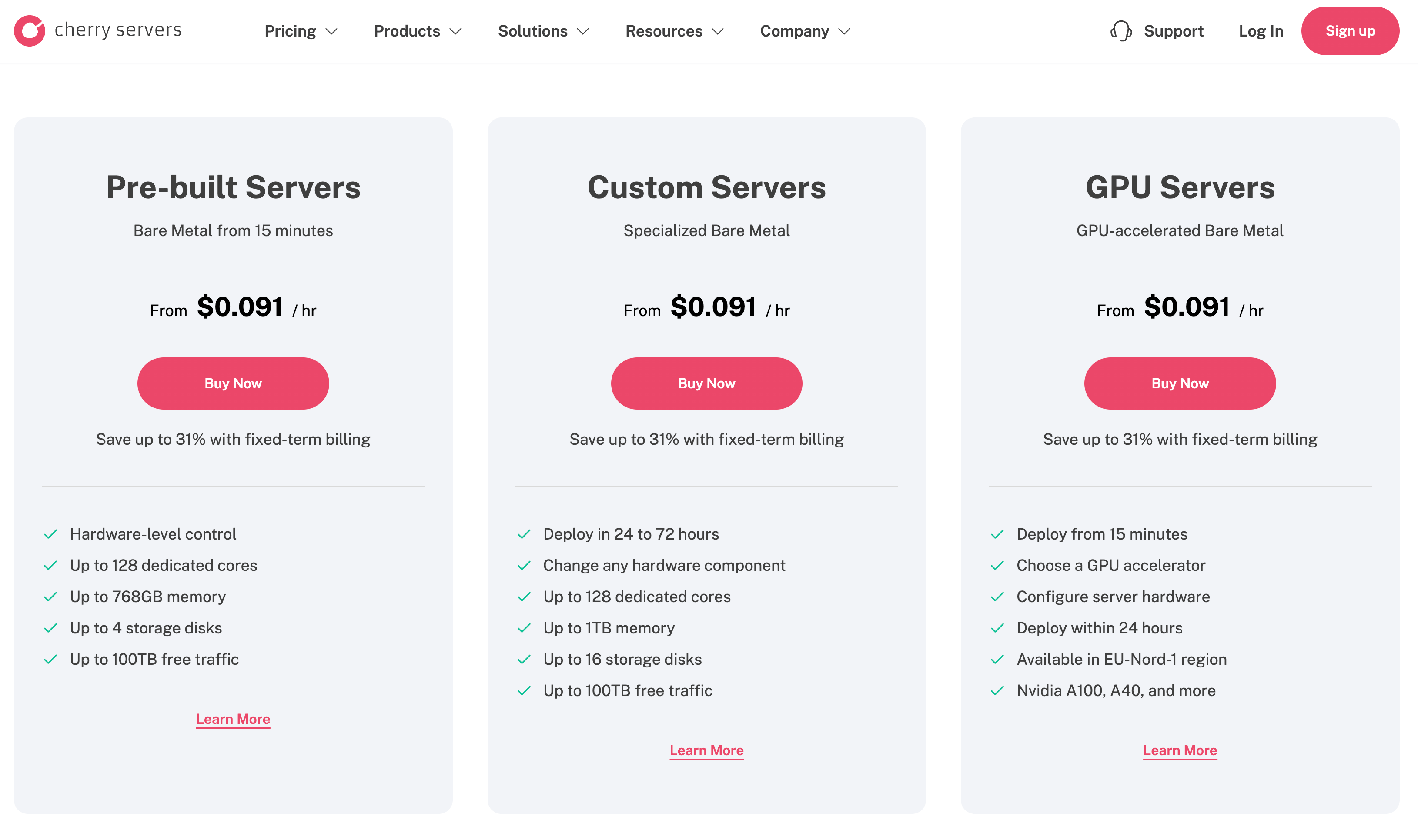 Based in Lithuania, Cherry Servers offers pre-built and customizable bare metal servers with transparent hourly or monthly pricing. Pre-built systems deploy in under 30 minutes, while custom builds support tailored configurations with a 24–72 hour lead time. Cherry Servers combines bare metal performance with cloud-like tooling—supporting APIs, private VLANs, BGP routing, and IP-KVM. Pricing starts at $0.091/hr (~$66/month) and includes free backup storage, traffic tiers up to 100 TB, and real-time monitoring. It is a solid choice for teams building AI/ML workflows, blockchain node hosting, video platforms, or performance-sensitive SaaS apps.