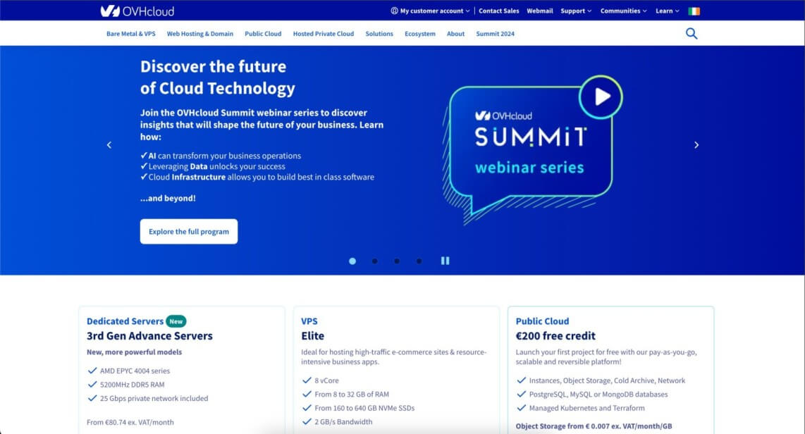 OVHcloud stands out for its strong security and wide global network. They offer unlimited data transfer, with speeds ranging from 500 Mbps to 10 Gbps. This makes them suitable for businesses that need high-speed data transfer without extra costs.