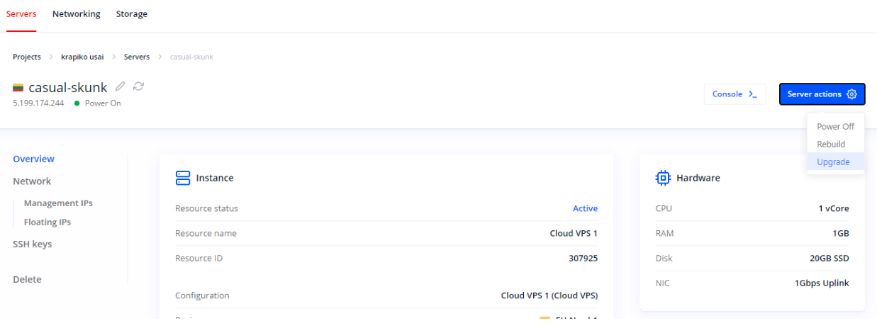 Cloud VPS servers can be scaled to a higher tier plan without the loss of any data. If your workload exceeds your current plan, you may opt to upgrade your server, select the tier you would like to scale into, and your data will be transferred to the new server automatically. To begin the process, simply choose the “Upgrade Plan” from the “Server Actions” button in the top right corner above your active server overview. An example of this is shown below.