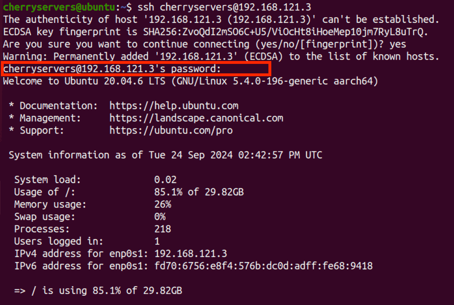 The server will prompt you for the password of the user’s account. Type your password and press Enter.