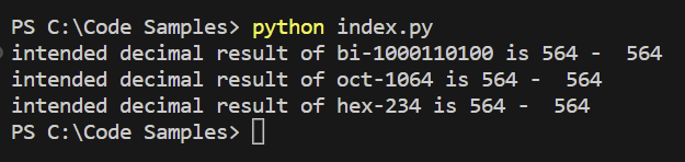 print("intended decimal result of hex-234 is 564 - ",int(hexadecimal, base=16))