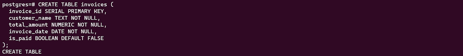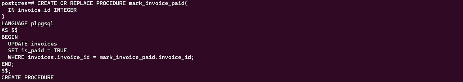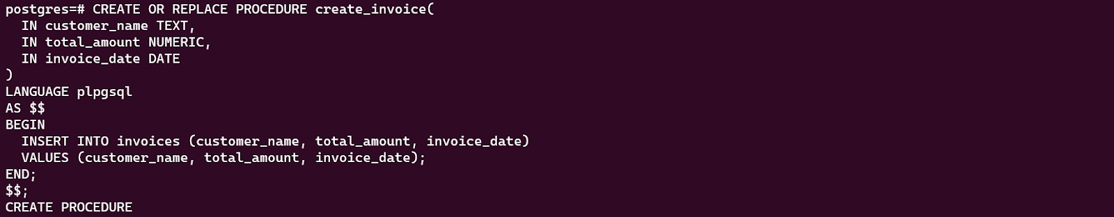 To populate the table invoices we created above, we will use the create_invoice procedure. To create the procedure, we enter the below code in psql: