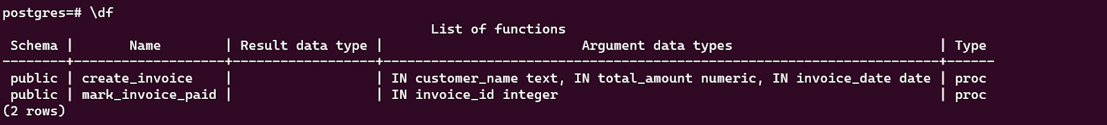 Now that we have created the stored procedures, we can list them using \df in psql.
