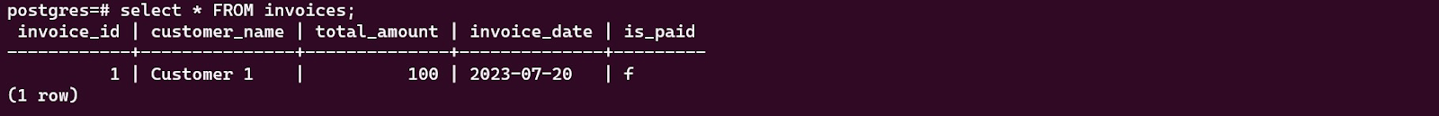 Listing the record of table invoices shows that the invoice with ID 1 has been updated. The field is_paid changed from f to t as expected.
