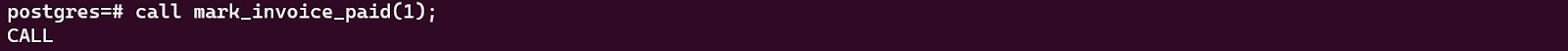 Now that we have created an invoice, we can mark it as paid using the mark_invoice_paid procedure. We call the procedure as follows: