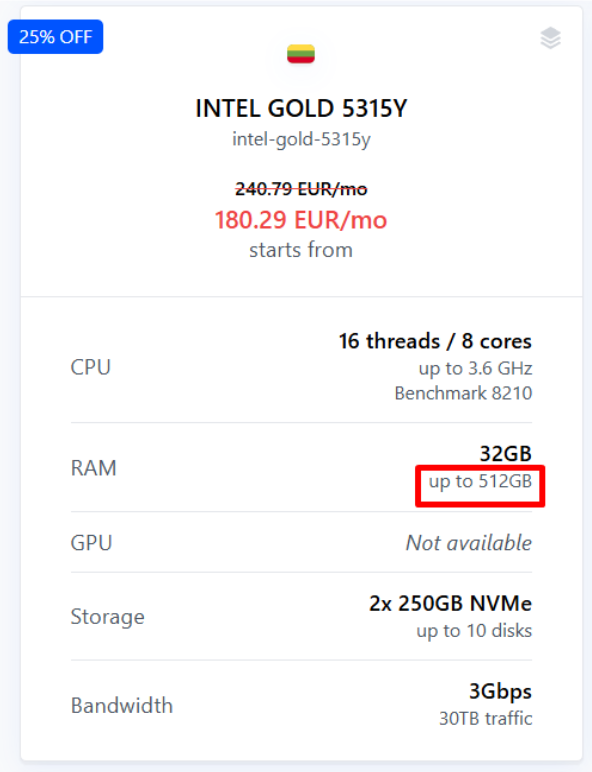 Our default server plans offer high speed, power efficient, high volume RAM to ensure optimal responsiveness for multi-thread operations. Each plan offers a certain amount of RAM included in the base price, with additional options available, depending on the plan. The maximum available RAM is indicated within each offer in grey text on a per server basis, as indicated by the image below.