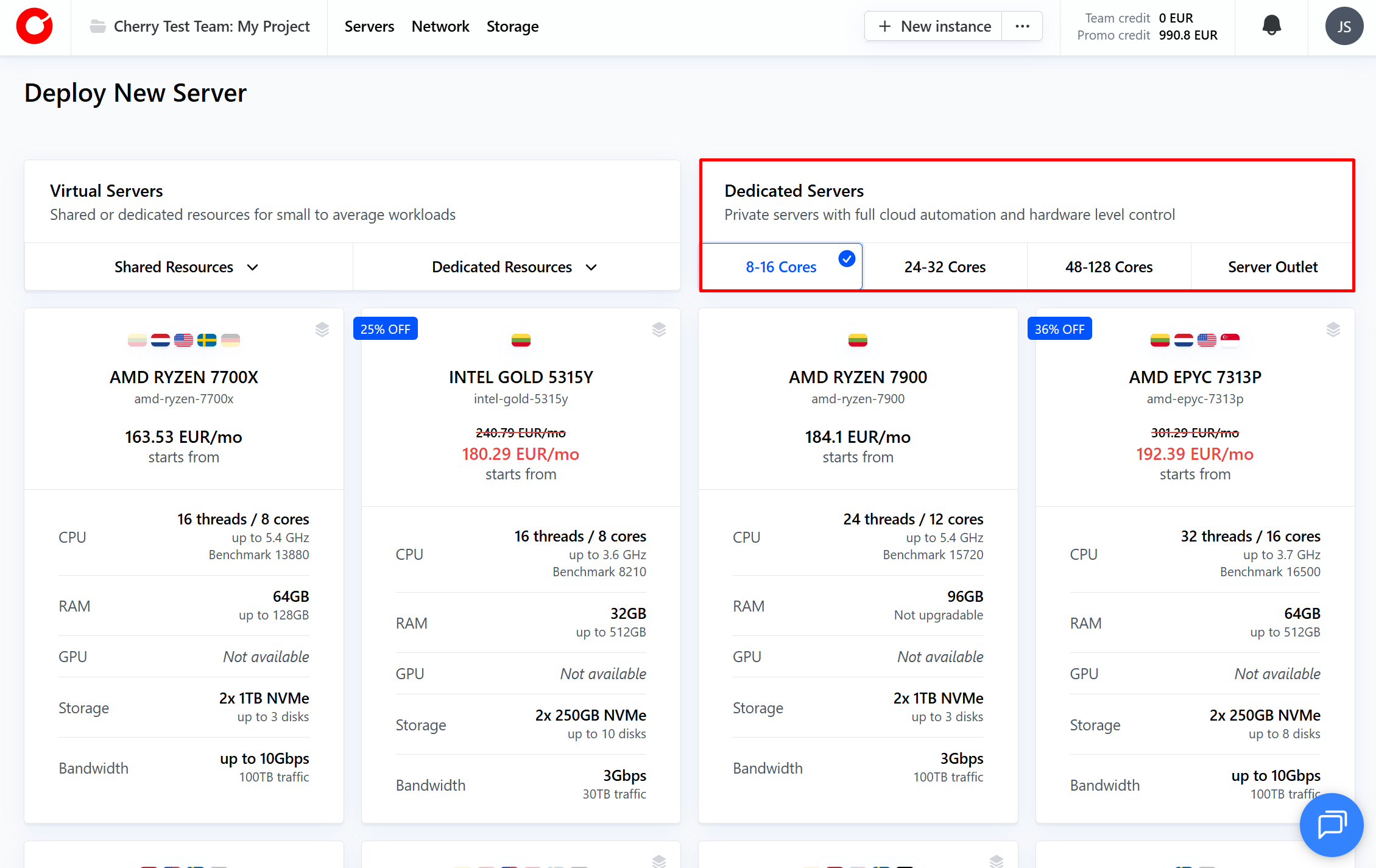 - Select the core range for the CPU you would like under “Dedicated Servers”