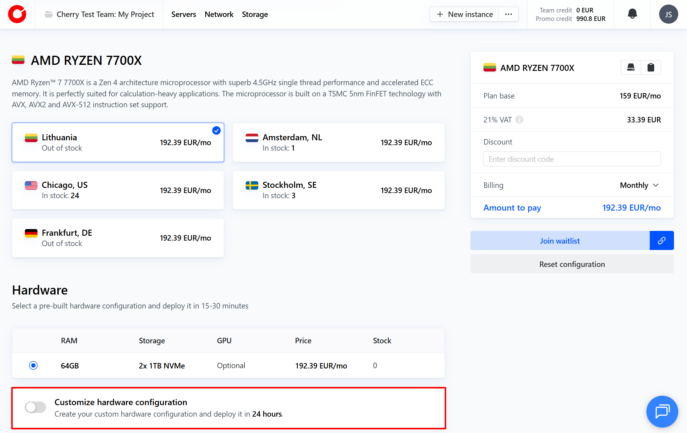 - To begin building your custom server, toggle the “customize hardware configuration” option.