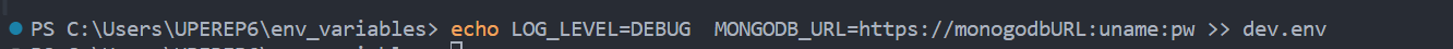 echo LOG_LEVEL=DEBUG MONGODB_URL=https://monogodbURL:uname:pw >> dev.env