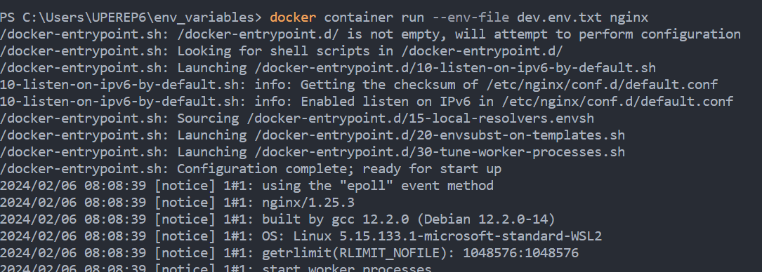 docker container run -it --env LOG_LEVEL='DEBUG' --env MY_ENV=development nginx /bin/sh