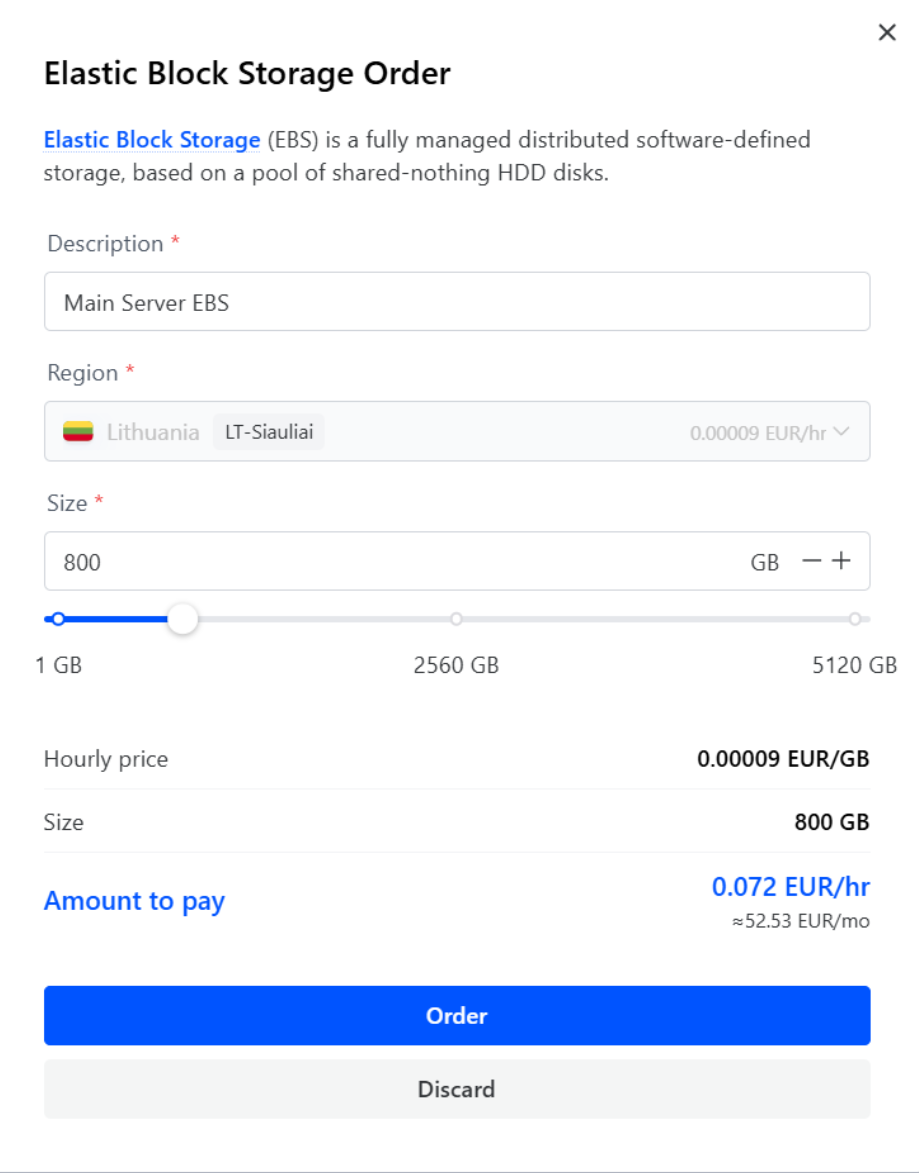 Name your EBS, scale the volume to your desired size, and click “Order”. The price will be dynamically reflected.