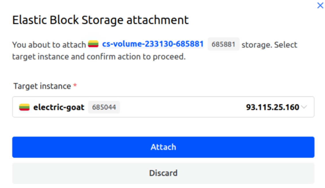 In the window that opens, you will be able to select the server to which you will attach the chosen EBS volume. Only compatible servers will be displayed.