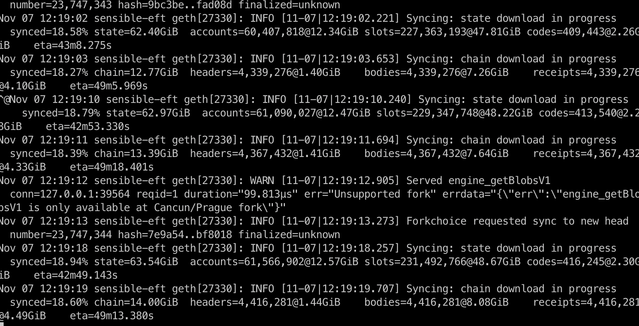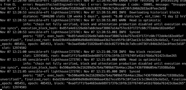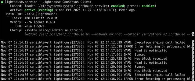 - Lighthouse will typically finish syncing first, usually within 1-3 days thanks to checkpoint sync. You'll see logs indicating slot processing and finalized checkpoints.