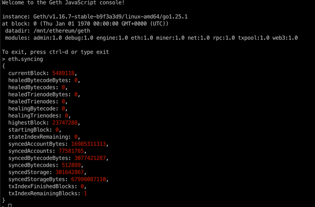 currentBlock: The block number Geth has synced tohighestBlock: The latest block on the network If fully synced, it returnsfalse. To exit the Geth console, typeexit.