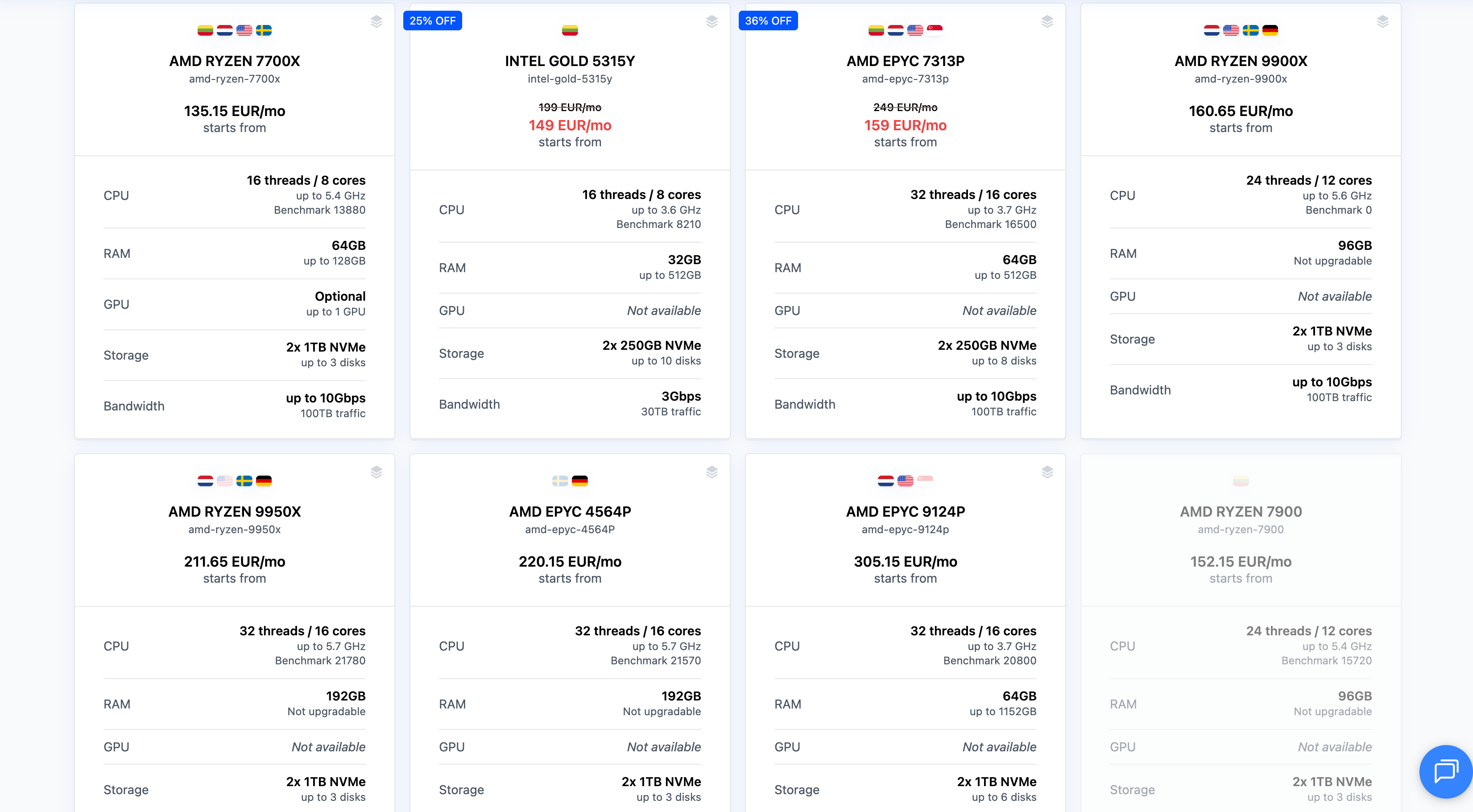 Note: Most bare metal servers come with basic storage configurations (often 1TB NVMe), but Cherry Servers allows you to customize storage capacity during the provisioning process. Look for options to upgrade or add additional NVMe drives to meet the 16TB requirement. Don’t settle for the default storage if it’s insufficient, archive nodes won’t fit on anything less than what’s specified above.