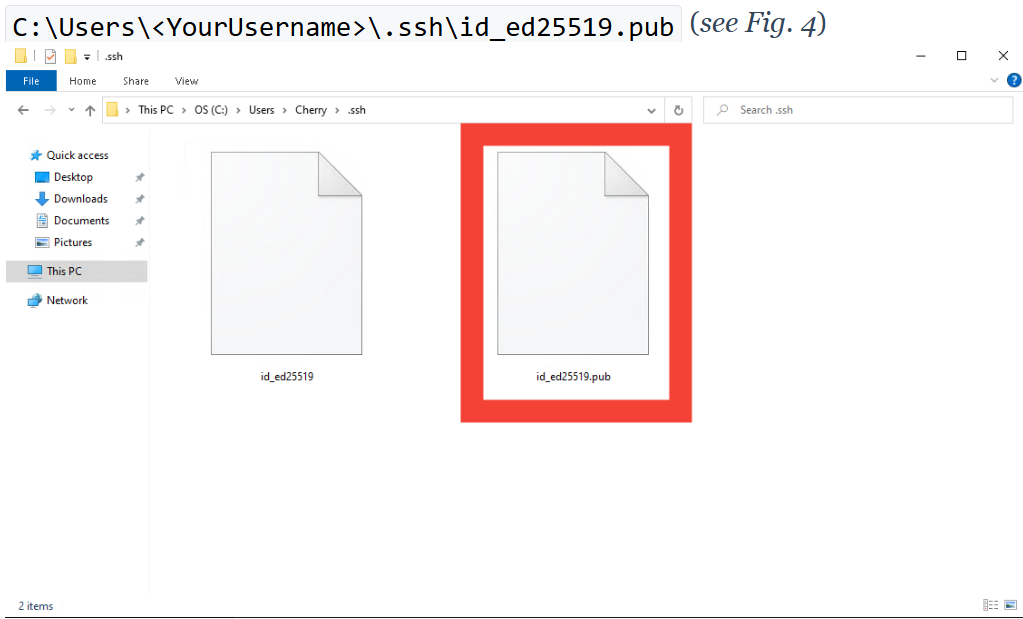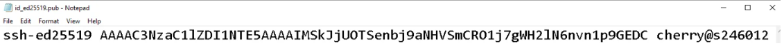 Your identification has been saved in C:\Users\Cherry/.ssh/id_ed25519. Your public key has been saved in C:\Users\Cherry/.ssh/id_ed25519.pub. The key fingerprint is: SHA256:5Ih/1NLOPFMRxbtwLSvCMU7ITM1CCVe1Q9sumWCAia0 cherry@s246012 The key's randomart image is: +--[ED25519 256]--+ | o.=++.oo oo| | . +.o.+. + o| | . =o.+ . .o| | E .+.+= +.oo| | S++o+ =oo| | = .+o.=.o| | . .o..*.| | .o| | o| +----[SHA256]-----+