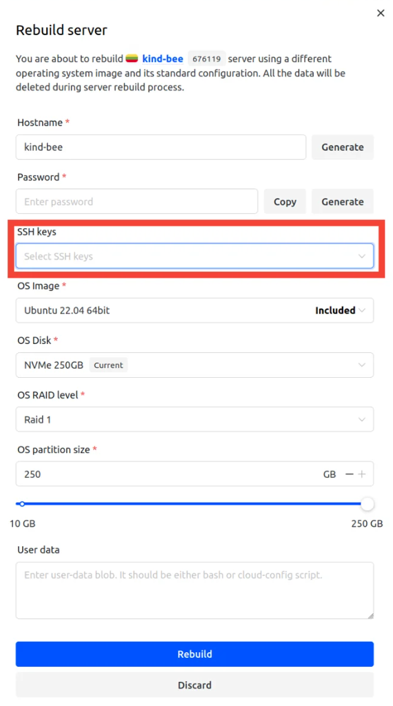 The same SSH key selection is also available when rebuilding a server. This is useful when reinstalling the operating system or resetting your server configuration.