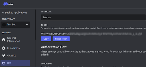 bot.pyand replaceYOUR_DISCORD_TOKENwith your actual token.import discord import os from dotenv import load_dotenv from discord.ext import commands intents = discord.Intents.default() intents.message_content = True bot = commands.Bot(command_prefix="!", intents=intents) load_dotenv() @bot.event async def on_ready(): print(f'Logged in as {bot.user.name}') @bot.command() async def greet(ctx): await ctx.send('Hello, I am your Discord bot') @bot.command() async def list_command(ctx): await ctx.send('You can use the following commands: \n !greet \n !list_command \n !functions') @bot.command() async def functions(ctx): await ctx.send('I am a simple Discord chatbot! I will reply to your command!') TOKEN = os.getenv('DISCORD_TOKEN') bot.run(TOKEN) -