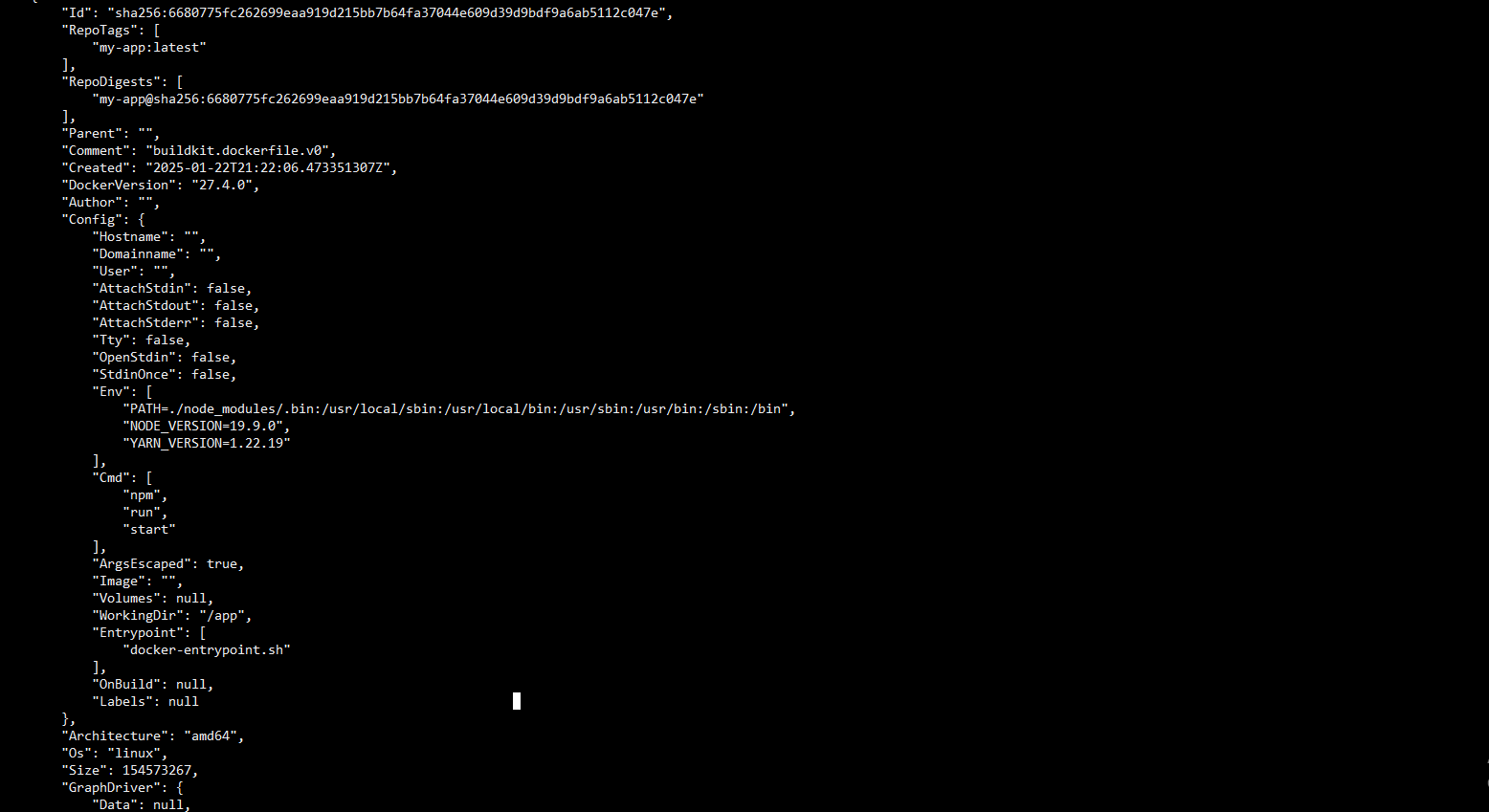 If the image was created successfully, you will get the following output showing the name of the image you just created and its details. Your application’s project name will be the image name. The output can also include the base image which is node:19-alpine3.16.