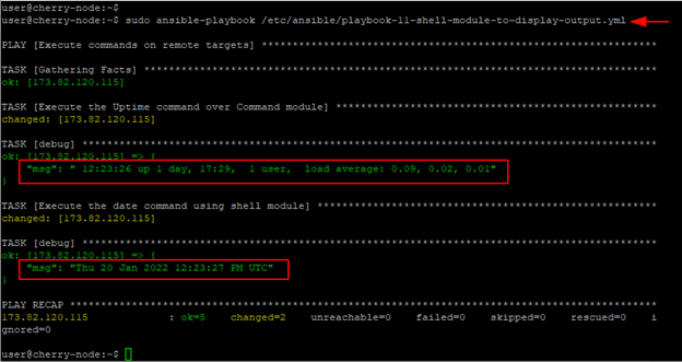 In the playbook execution output, you can see the output of both commands printed: