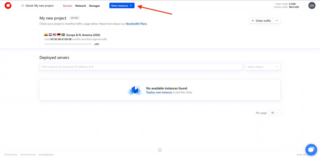 On your project dashboard, you should see a blue New instance button in the nav bar. Click on it to proceed to the server deployment page.