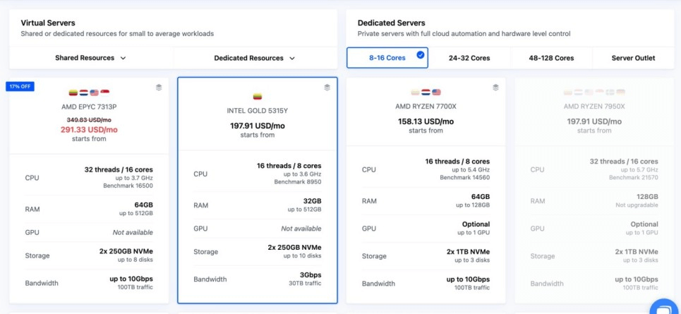 Inside the Dedicated Servers tab, you will see the plans arranged by performance tier: 8–16 Cores, 24–32 Cores, 48–128 Cores, and the Server Outlet section.