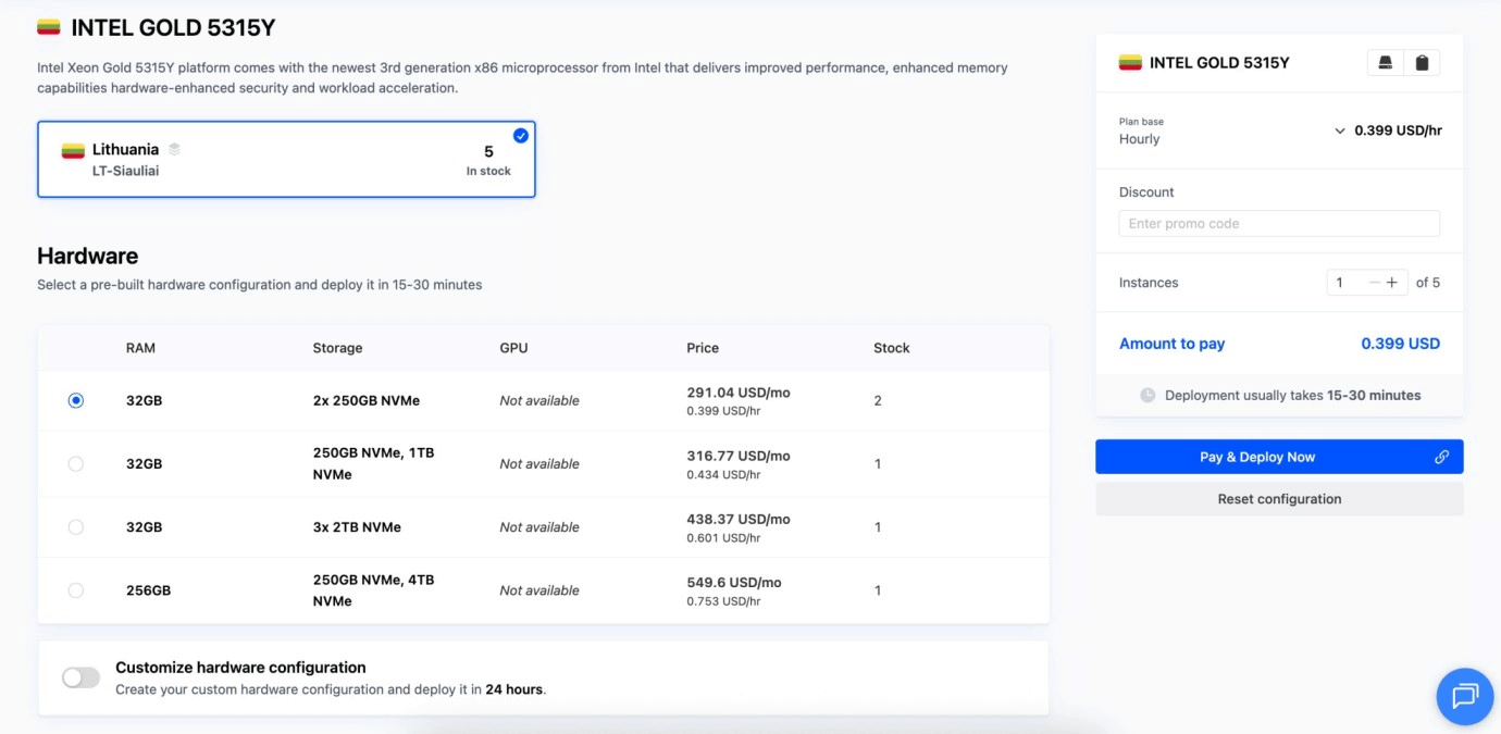 We are going with 32GB RAM and 2x250GB NVMe. It is a balanced starting point that works for most general workloads. If you need a different setup, you can select another preset or enable Customize hardware configuration, but it extends deployment to about 24 hours.