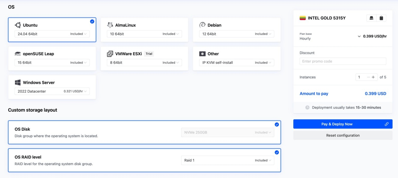 For this guide, we will select the highlighted Intel Gold 5315Y server in the 8–16 Cores tier. It comes with 8 cores (16 threads), 32 GB of RAM, 2x250 GB NVMe drives, and 3 Gbps bandwidth with a 30 TB monthly limit. This is enough for a wide range of small to medium workloads.