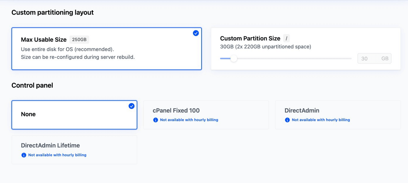 Below that is the Control panel section. Here you can choose whether to install a management interface. Selecting None deploys the server without a control panel, leaving all setup to be handled manually. cPanel Fixed 100 is a popular choice for hosting environments, but it is not available with hourly billing. DirectAdmin is a lighter alternative to cPanel, though it is also unavailable with hourly billing.