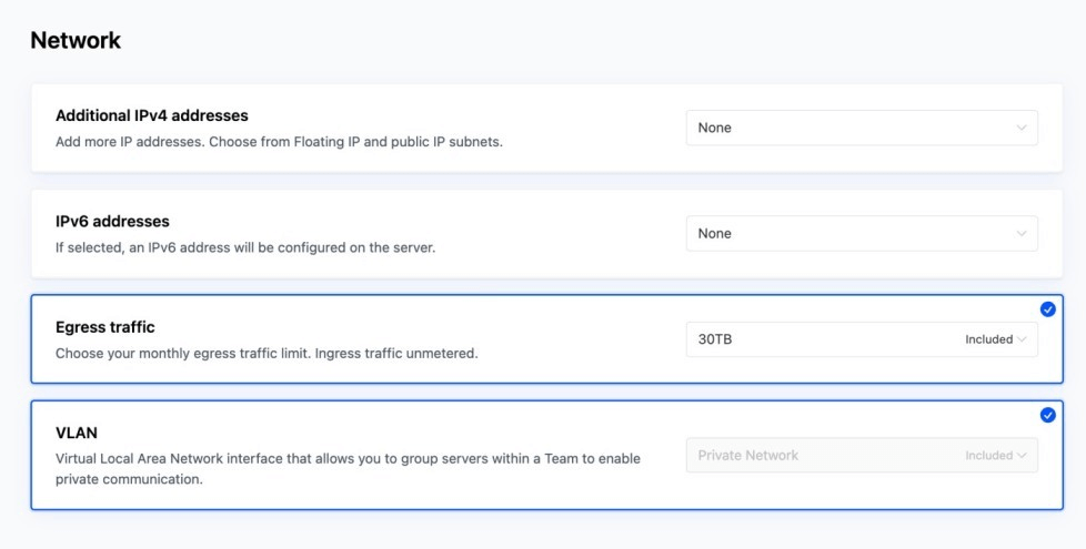 Here, you can choose extra IPs, turn on IPv6, set the monthly egress cap, and decide whether to place the server on a private VLAN. Each option changes how the server will behave once it is online.
