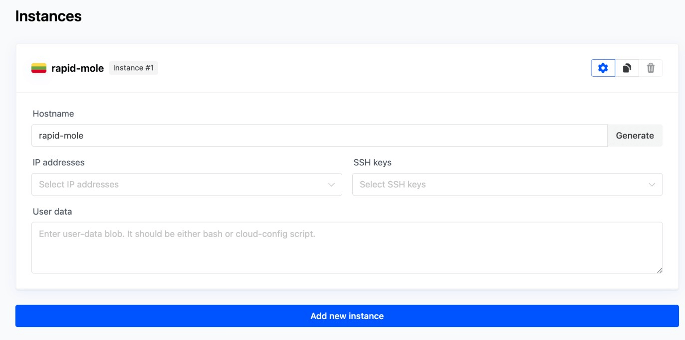 Also, if you need more than one server, click the Add new instance button to duplicate the card. Adjust names, keys, or settings for each. The Instances count in the sidebar updates as you add or remove them.