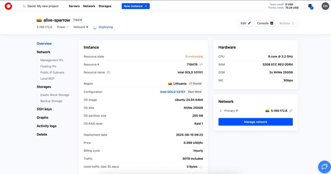 You now have a bare metal server online and ready to run your workload. In under 15 minutes, the setup went from login to a fully active machine with direct hardware control and root access.