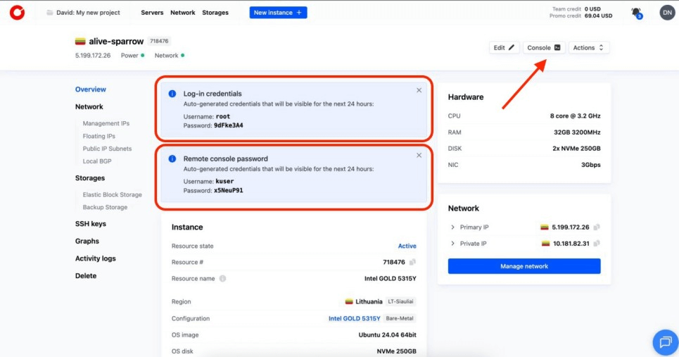 With the server active, you will see two sets of credentials: Log‑in credentials (for SSH in a terminal) and Remote console password (for the Supermicro console).