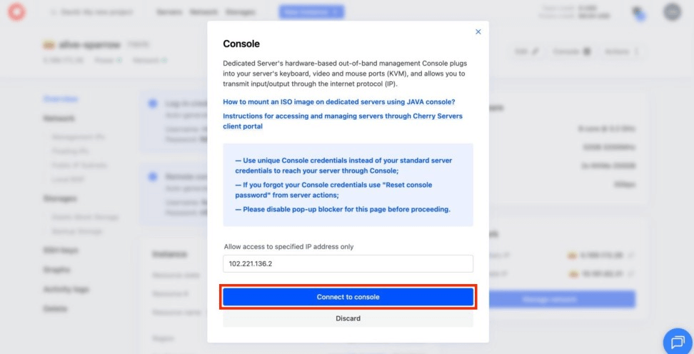 To open the remote console, click Console, then Connect to console in the pop‑up.