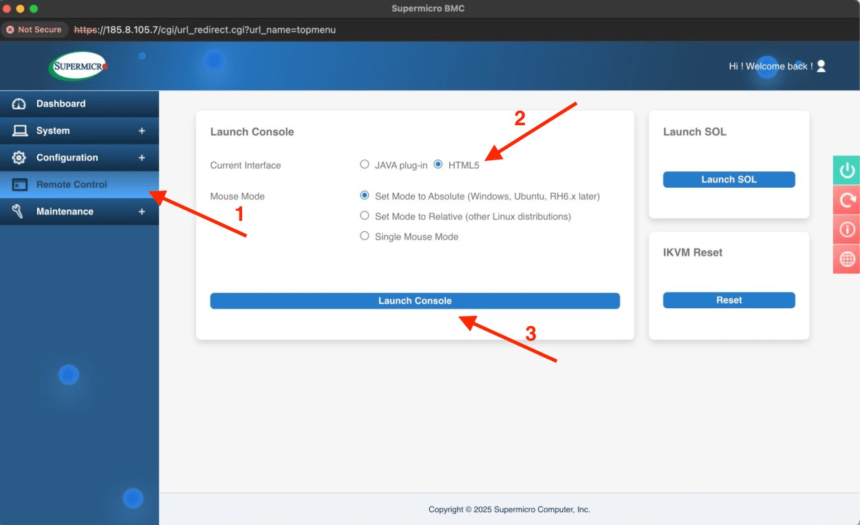 After login, you will be redirected to Supermicro’s dashboard. Open Remote Control from the left menu. Select HTML5 as the interface, then click Launch Console to start the KVM session.