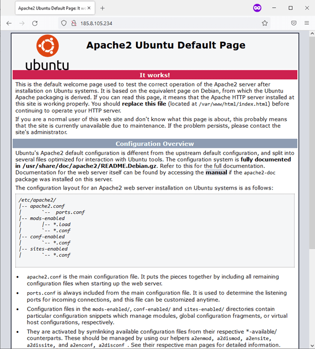 As you can see, apache2 had been active and running right after you installed it. You may perform a spot check to verify that it is working as intended by requesting a default Apache index page. Just type the IP address of your server to your web browser and press enter:
