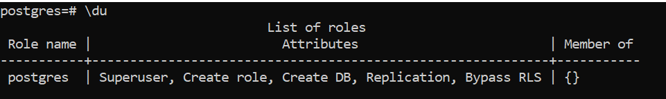 And to see a list of all the users with their privileges use \du command.