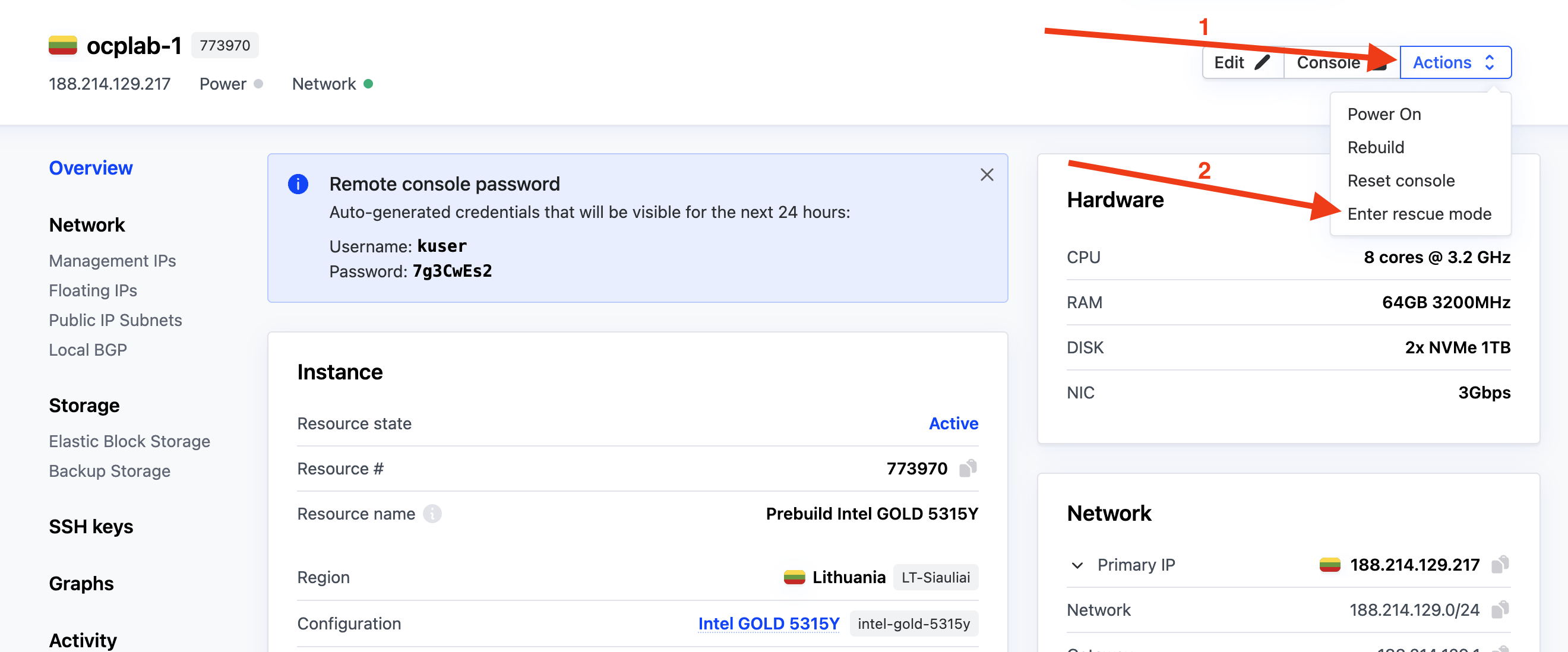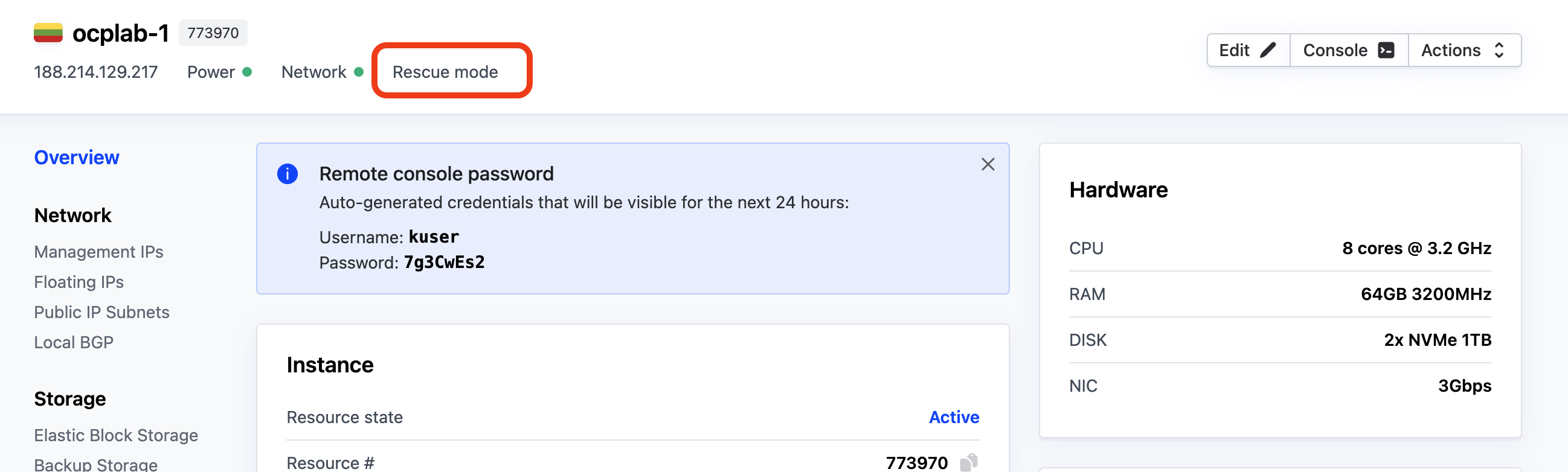 With our servers deployed, we can grab the MACs from each server using Rescue mode. From each server’s dashboard, click the Actions dropdown, then select Enter rescue mode.