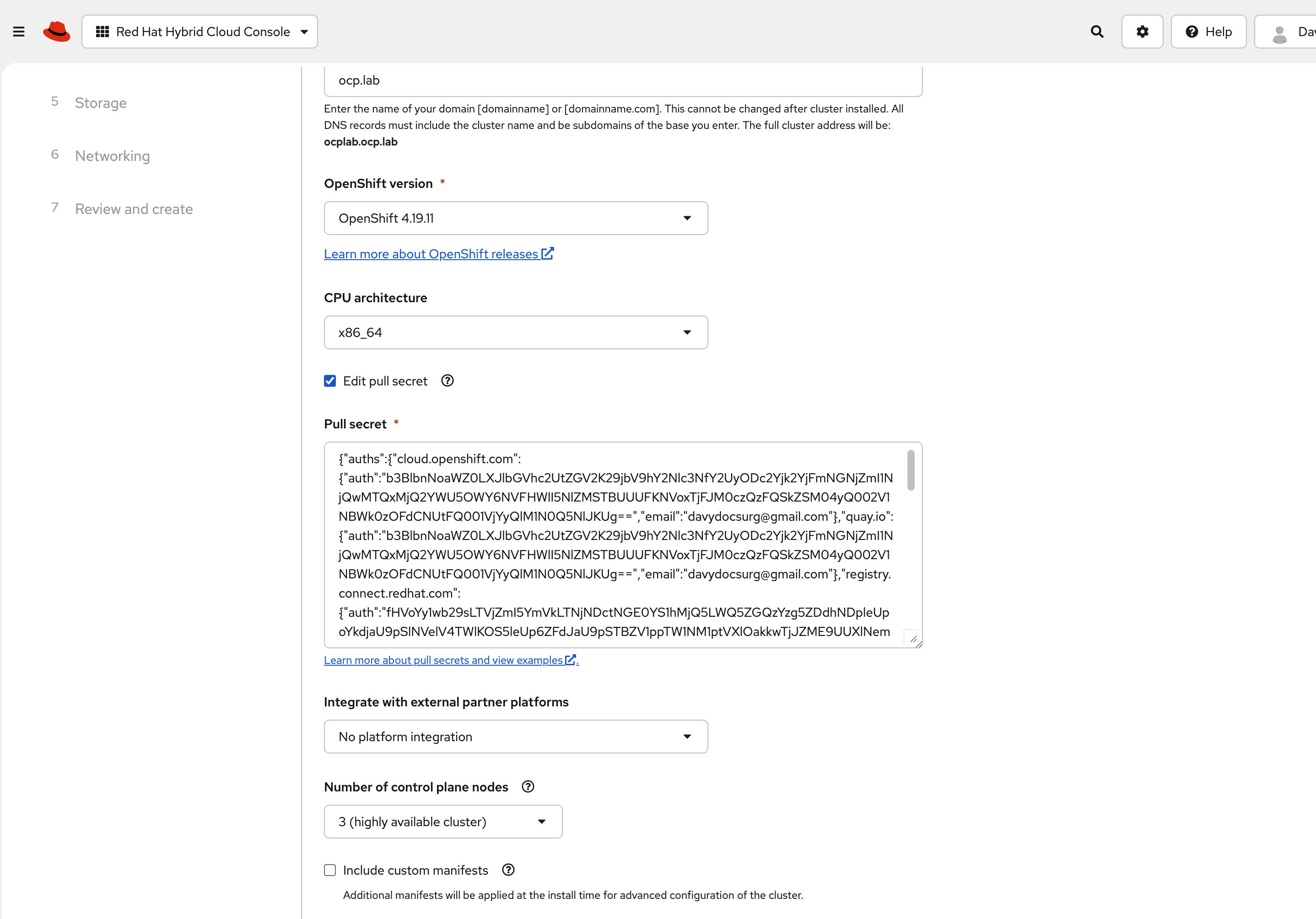 - Pull secret: Create and download a pull secret from the console. It is required for pulling container images during installation.
