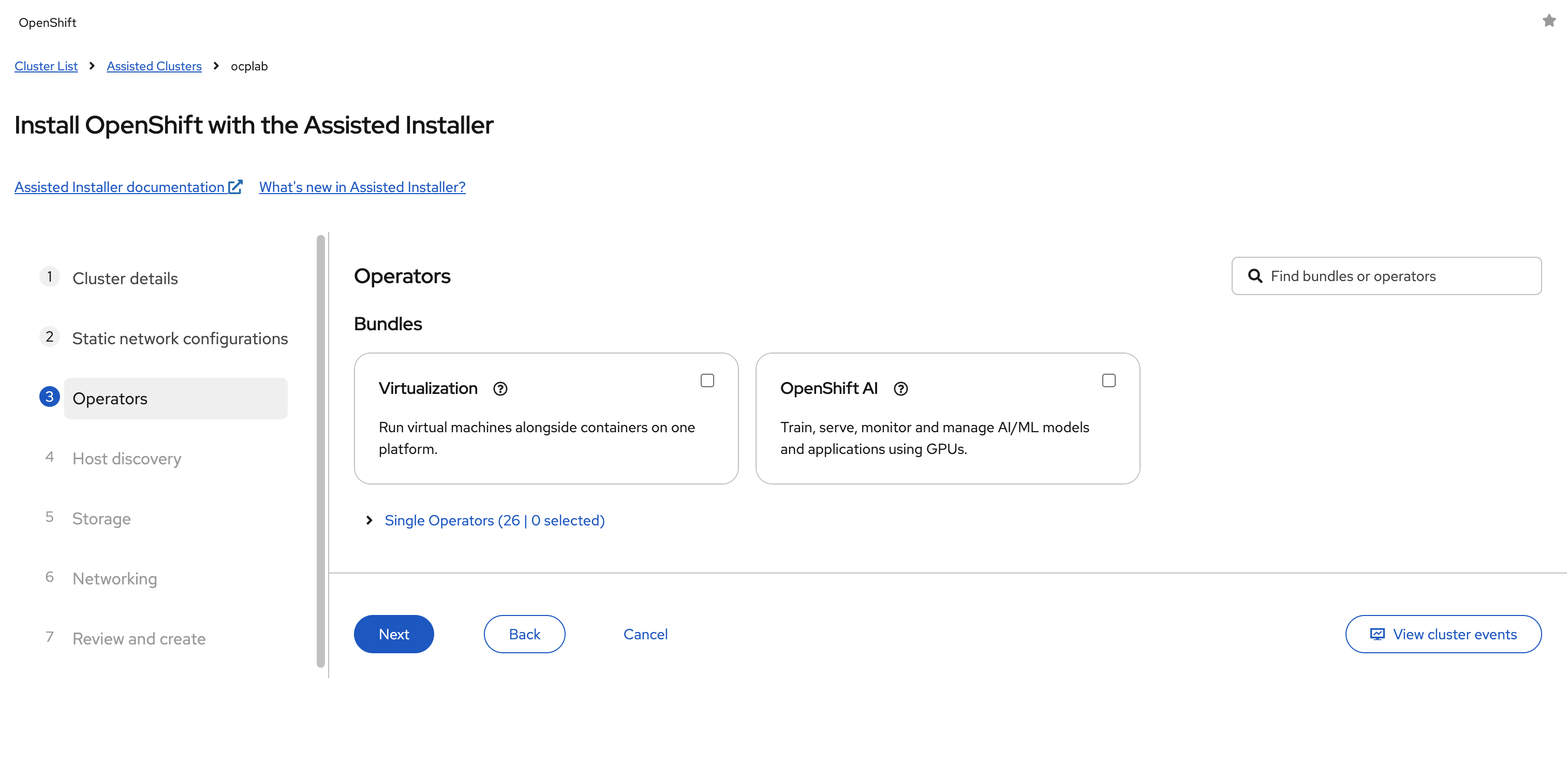 The Assisted Installer gives us the option to add Operators during the initial setup. These include features like Virtualization, which allows us to run virtual machines directly on OpenShift, or OpenShift AI, which is used for GPU-based workloads.