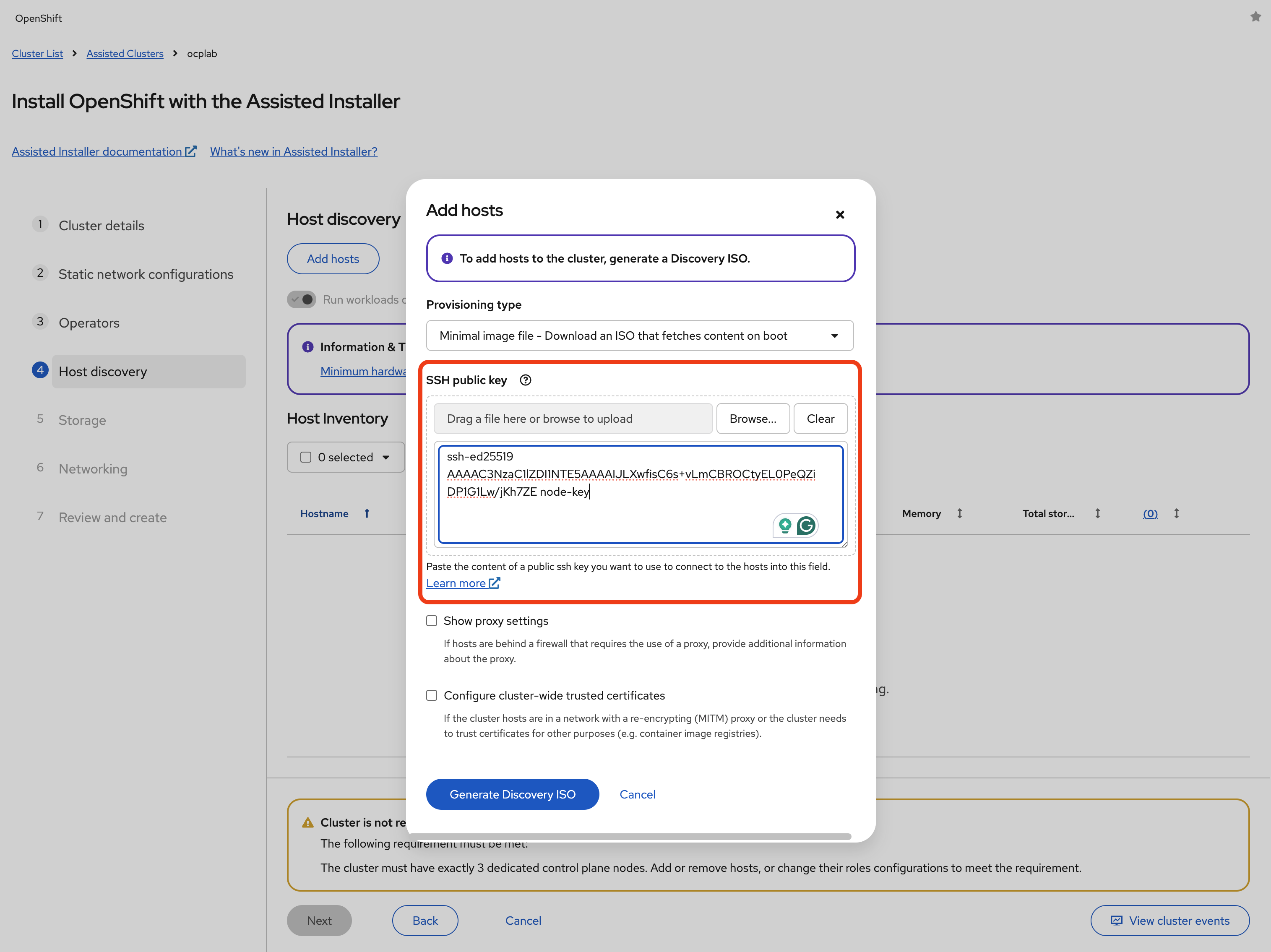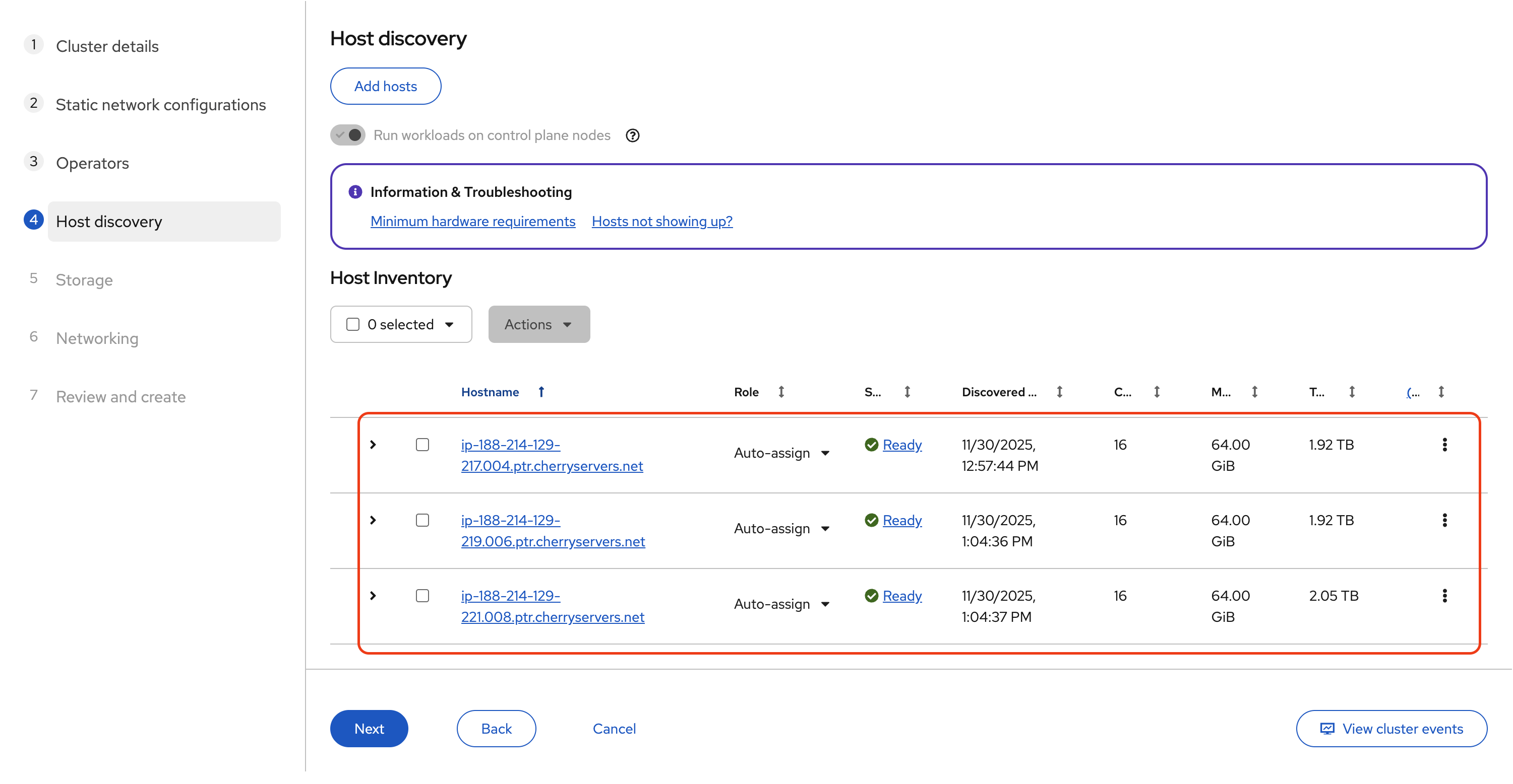 Here, we bring our servers into the Assisted Installer. We do that with a Discovery ISO. The ISO contains the static network configuration we set earlier. Once a server boots from it, the Assisted Installer will recognize it and add it to the host inventory.