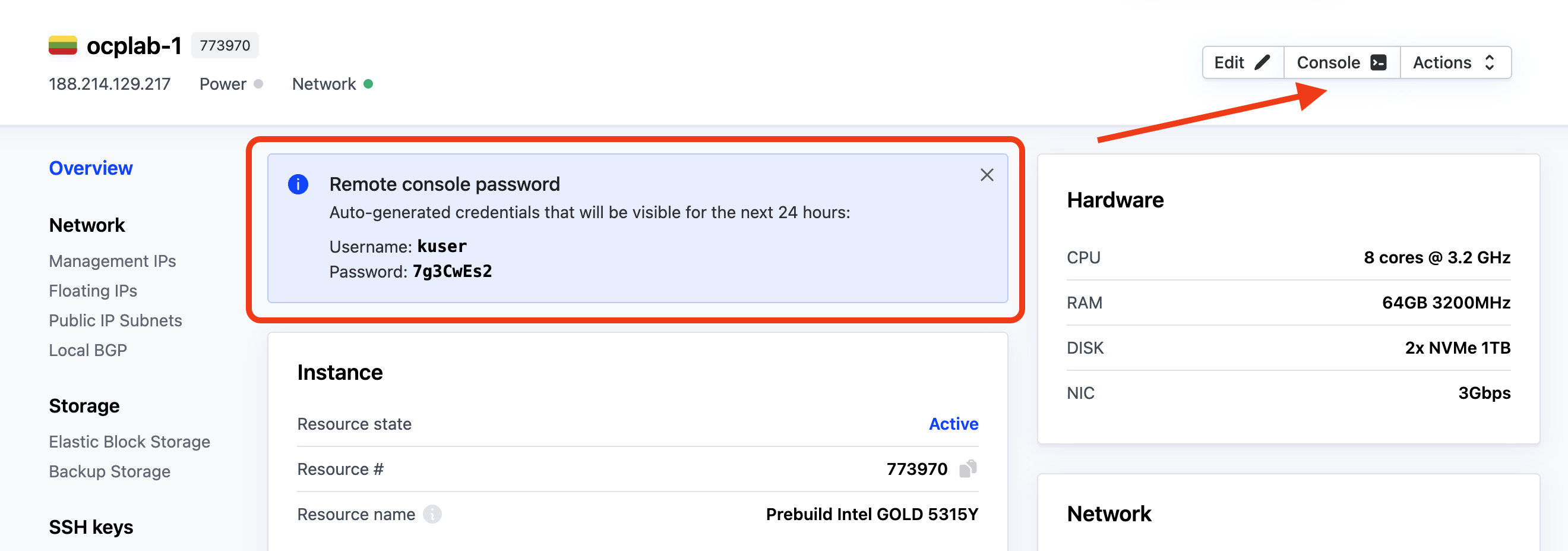 First, we log in to the BMC web console of each server. Back in Cherry Servers’ dashboard, click on the first server (ocplab-1):
