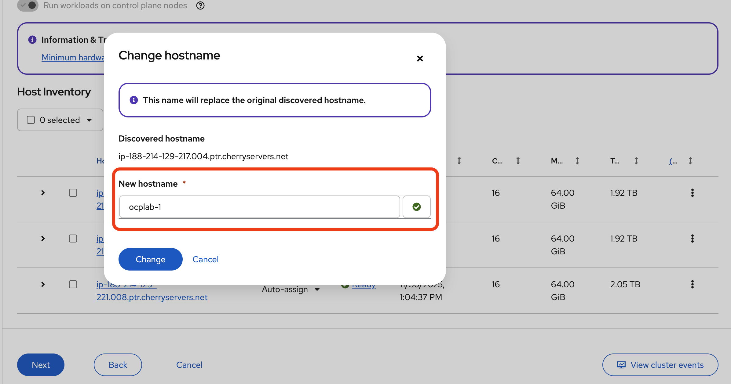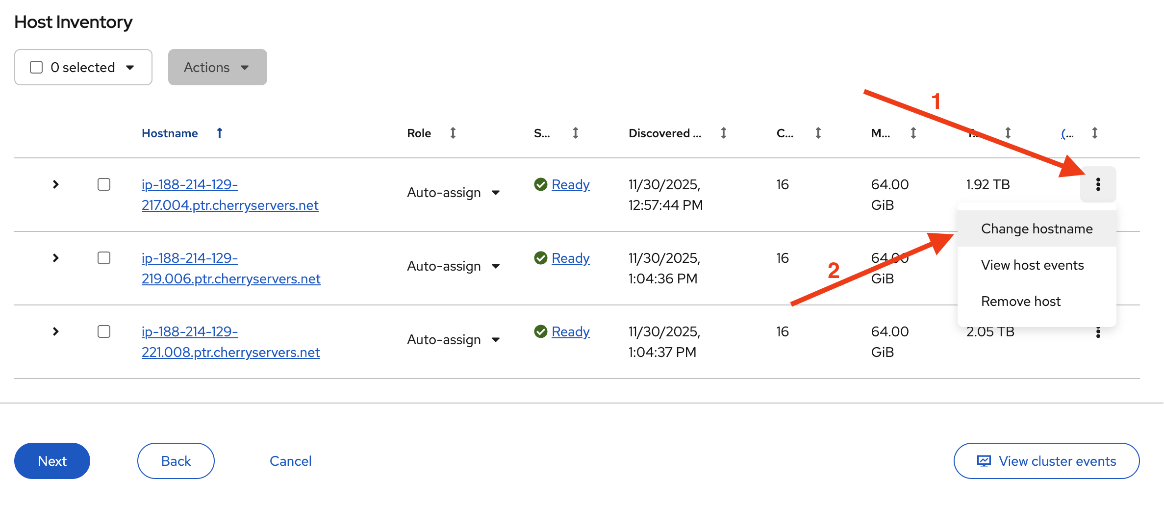 Once they are ready, it is good practice to rename them to something more readable. For each host, click the actions menu (the three-dot icon at the end of the row) and choose Change hostname.