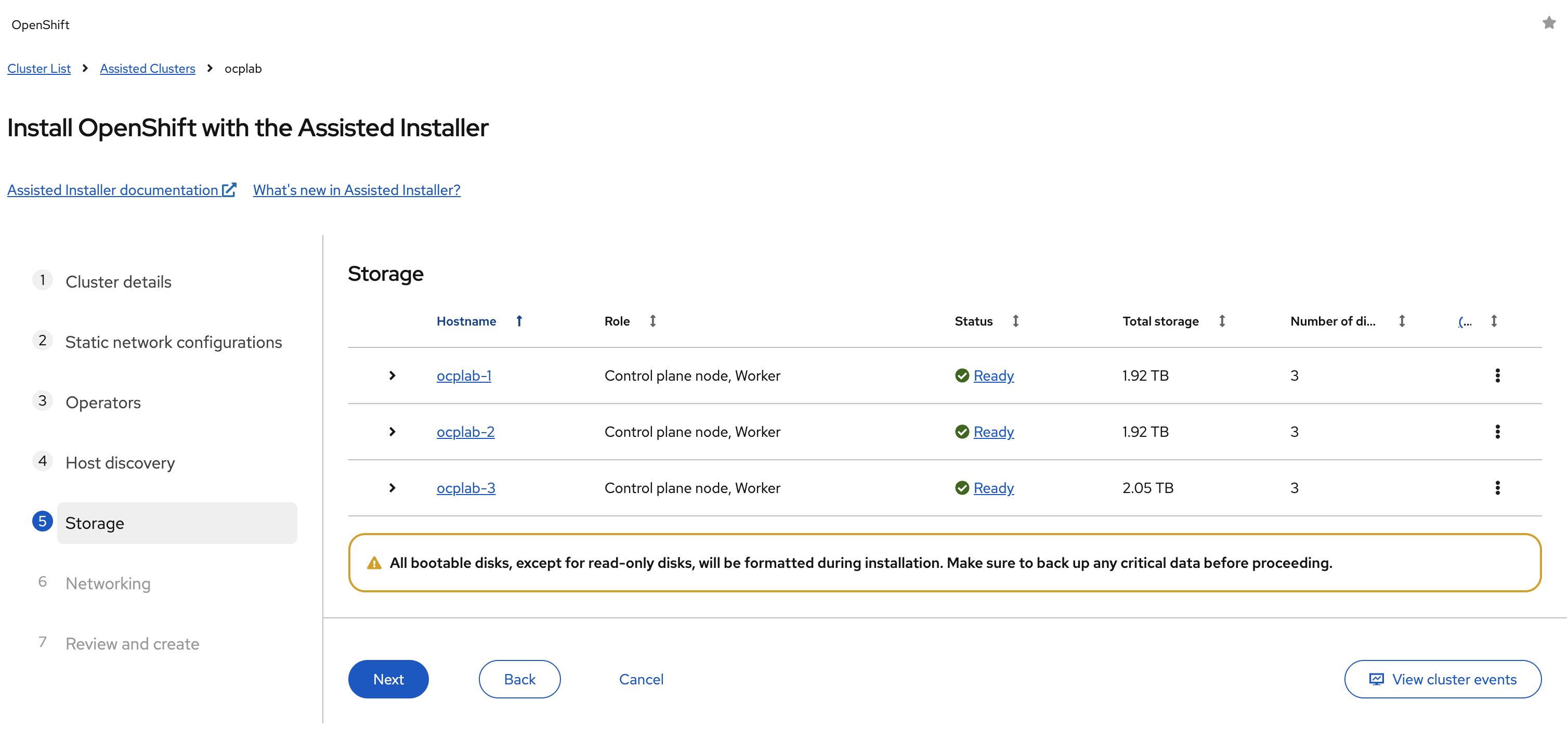 Moving on to the storage step. This is where we pick the installation disk for each host. The Assisted Installer will list all the available drives it detects.