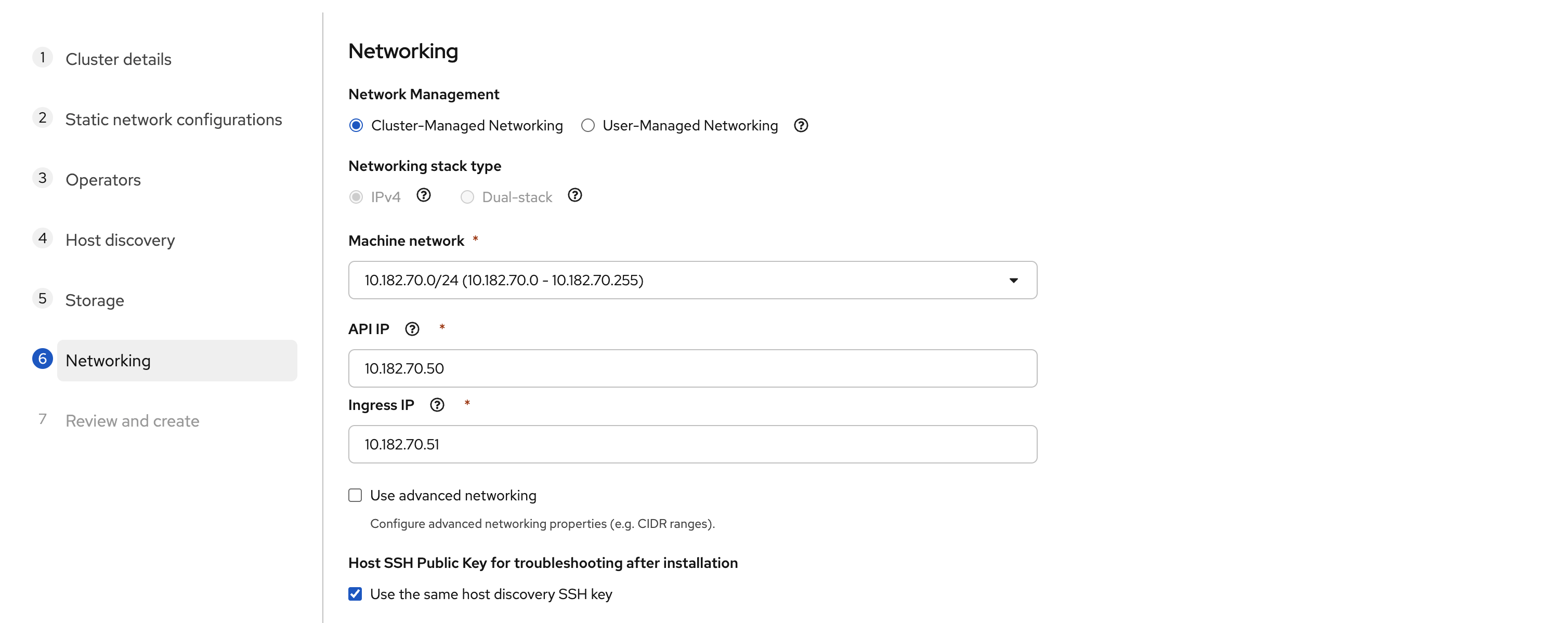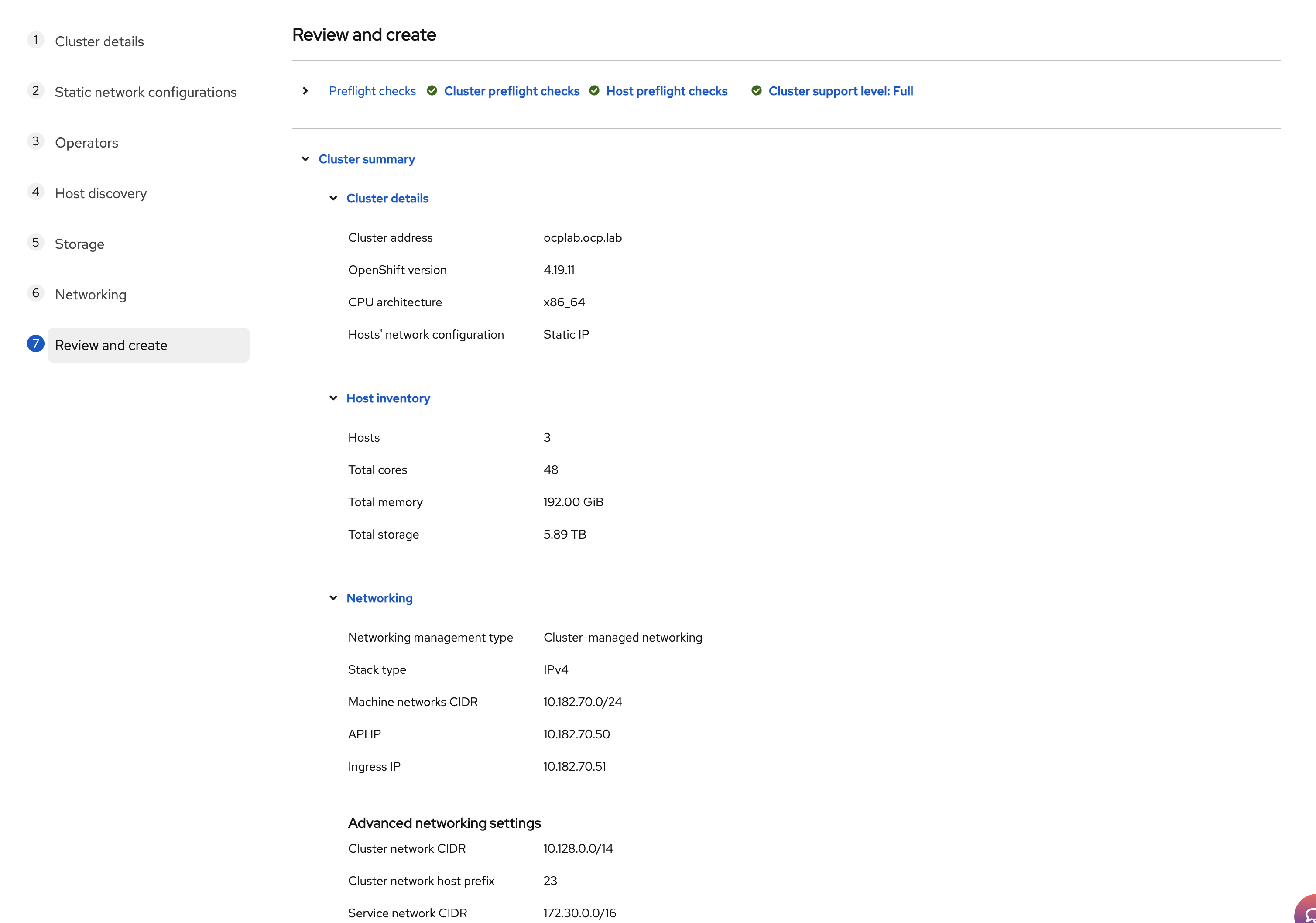 Expand the Networking section and read it line by line. The Machine network must match your VLAN subnet. The API IP and Ingress IP should be the exact values you picked in the Networking step, and they must be different from each other and from the node IPs.