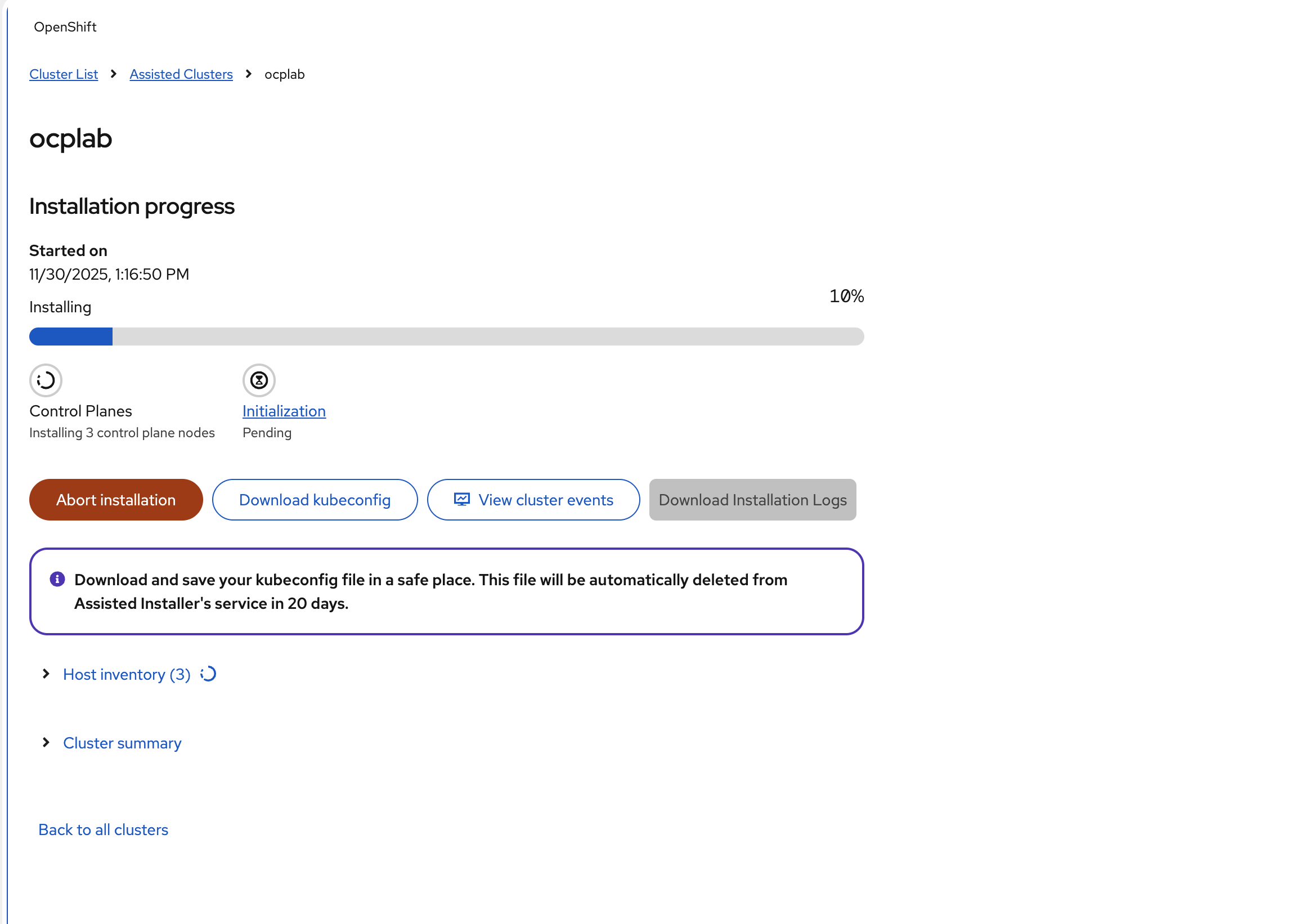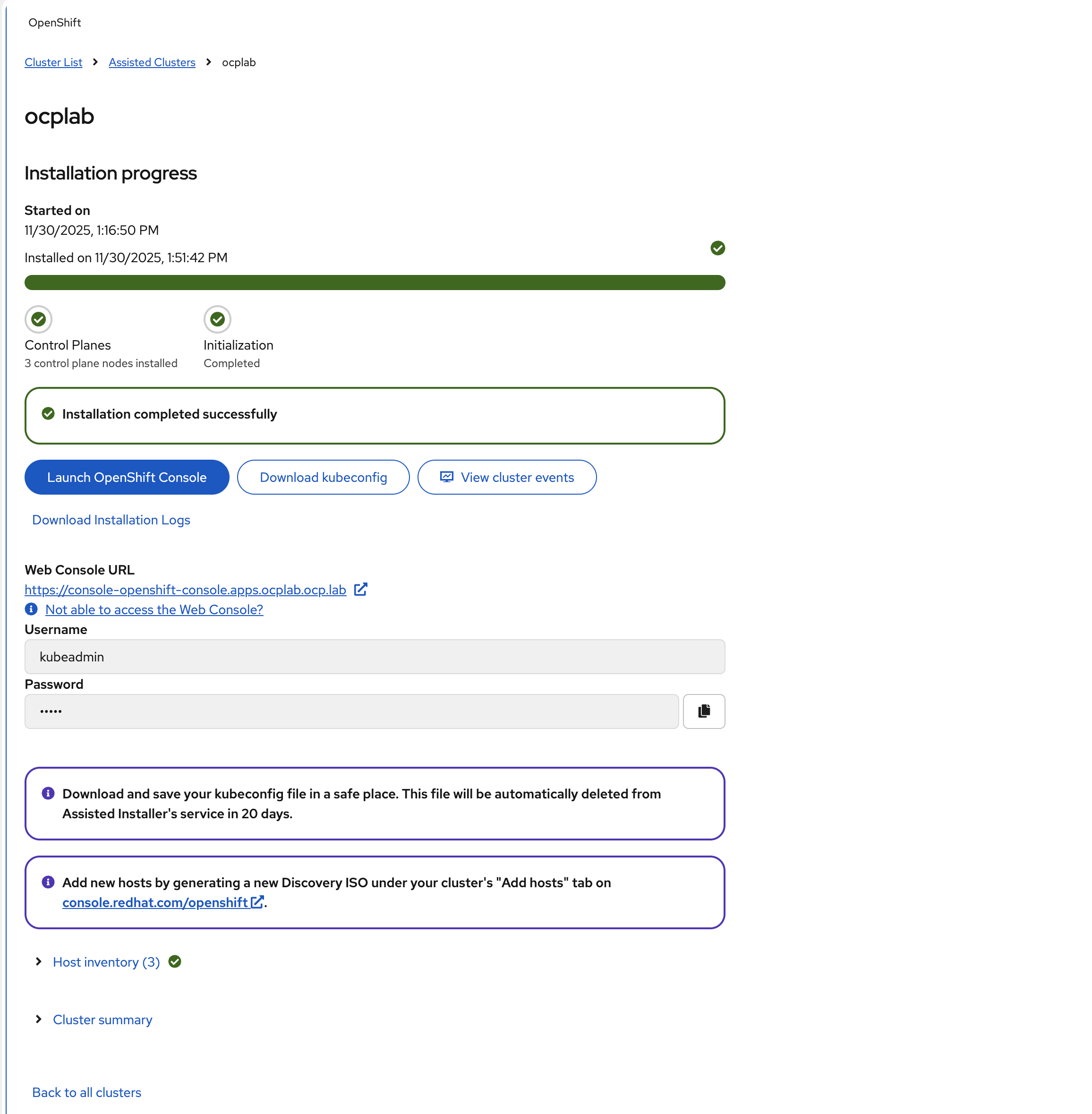 After the installation completes, the Assisted Installer displays a success message along with your cluster credentials and console URL. We need to download the credentials and verify that the cluster is accessible.