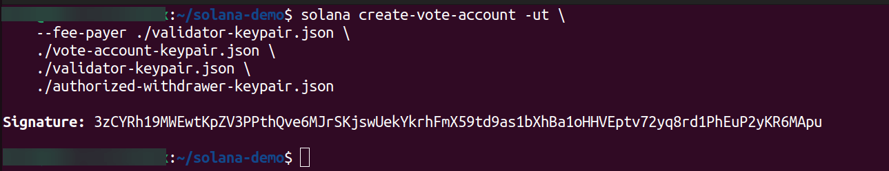 Now, you can use the Solana cluster to create a vote account. Note that all commands mentioned so far should be done on your trusted computer and NOT on a server where you intend to run your validator as you shouldn’t be creating your account credentials on just any computer: